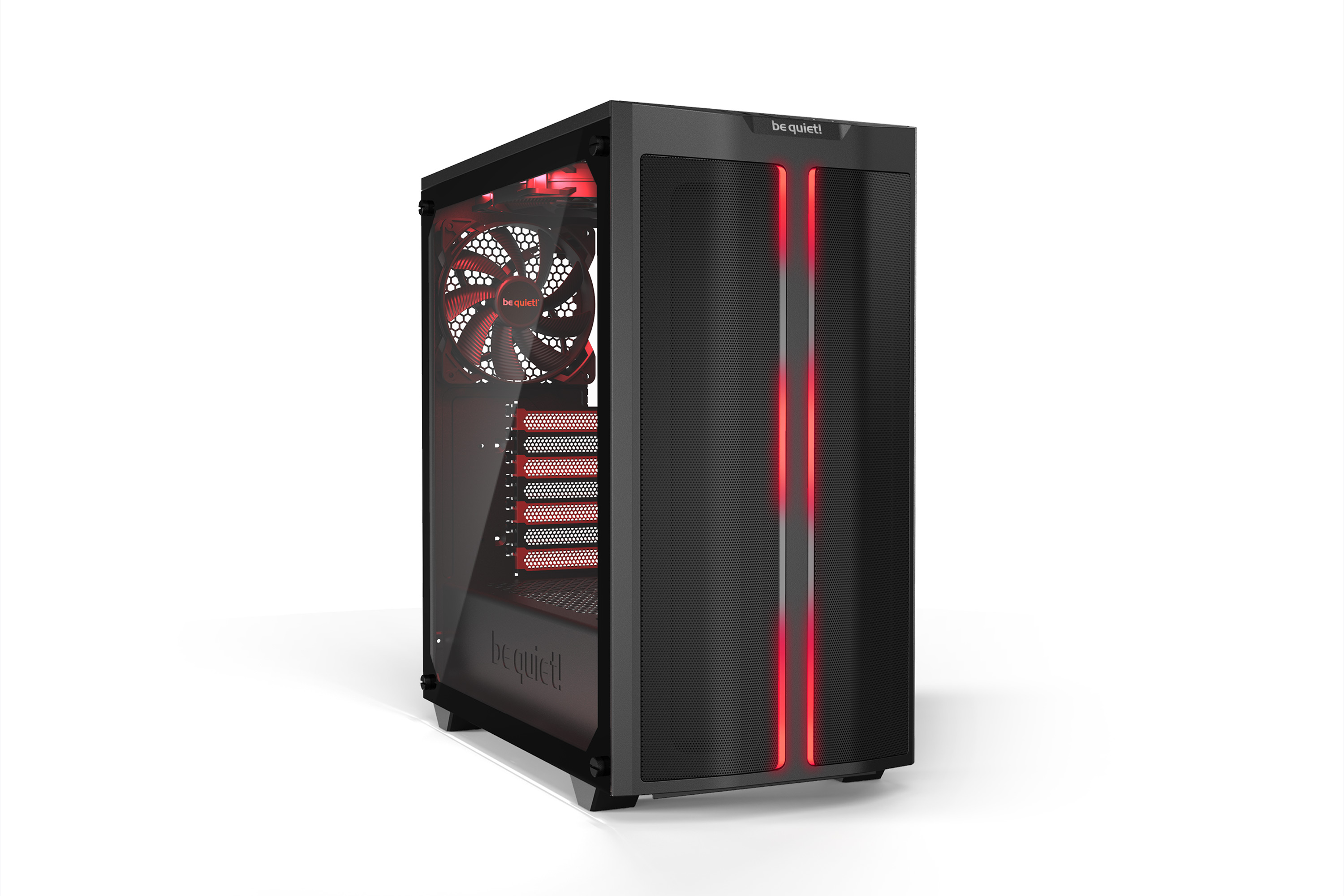 3 preinstalled Pure Wings 2 fans with airflow-optimized fan blades that ensure perfect airflow and cooling. Despite the compact case design the fans at the front, top and rear are 140mm models, resulting in very quiet operation. Up to two 140mm fans can be installed in addition.